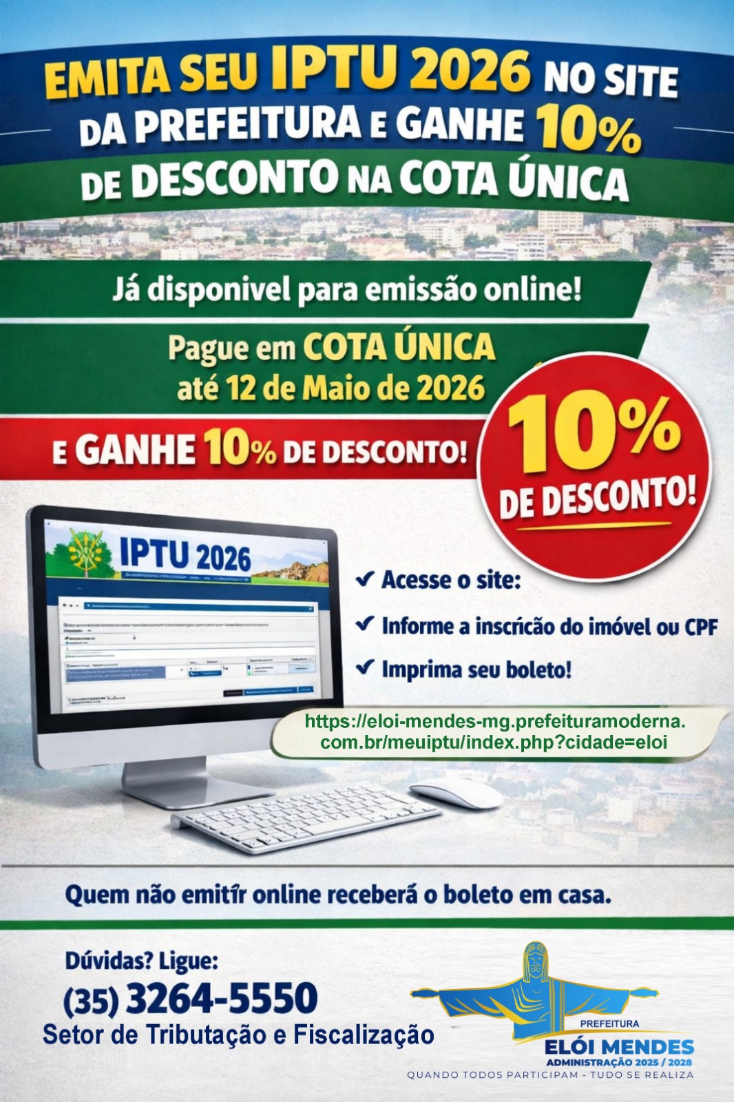 Através do site oficial da Prefeitura, é possível acessar o boleto do imposto em poucos cliques, evitando filas e deslocamentos. Além disso, quem optar pelo pagamento em cota única até dia 12 de maio de 2026 garante um desconto especial de 10% no valor total do tributo.
